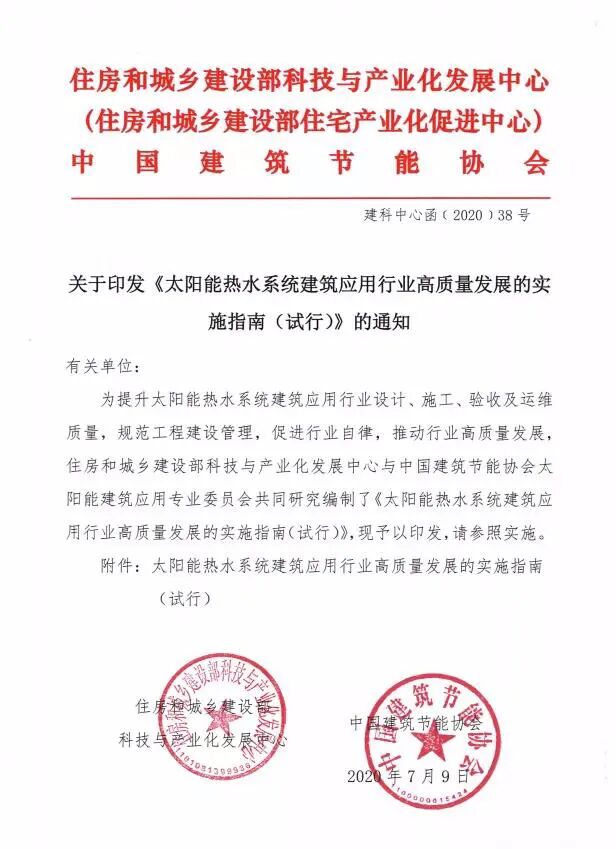 浏览量:0近日,住房和城乡建设部科技与产业化发展中心(住房和城乡建设部住宅产业化促进中心)、中国建筑节能协会联合发布了“关于印发《太阳能热水系统建筑应用行业高质量发展的实施指南(试行)》的通知”。
